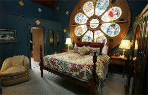Nicely sized rooms with vaulted ceilings and skylights, church-pew and four-poster beds, cozy in-room fireplaces, and waking in the morning to a rainbow of sunlight streaming through a stained glass window. Pretty special, I'd say!