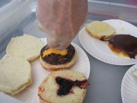 Wonder what this is? -> It's the gloved hand of Bob the Burger Guy, expertly creating a Cape Cod League baseball dinner delicacy ... for me. This is not your average baseball-game cheeseburger, as you've probably noticed. Yes. That's a jelly donut being used as a burger bun. And that's squirty can cheese going on top of the meat. |