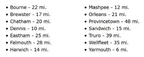 To give you a sense of how far it is from Cape Cod Gateway Airport in Hyannis to other towns on the Cape, here's a chart with the approximate mileage: